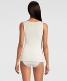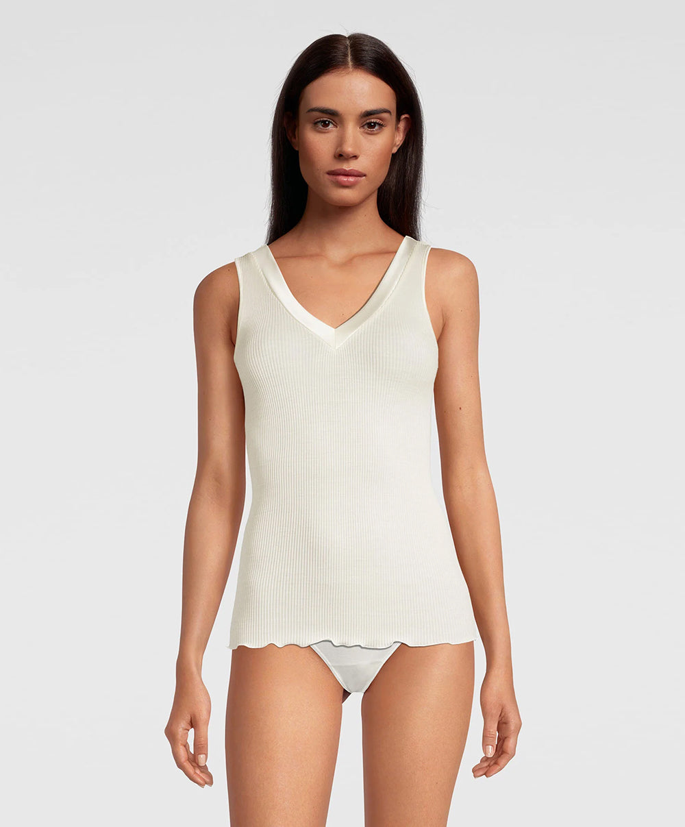 Débardeur élégance laine et soie col V bordure satin champagne collection Basic femme Wool & Silk de chez Oscalito.