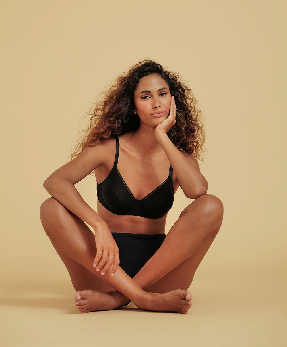 La collection de lingerie New Apesanteur de chez Antigel par Lise Charmel : la série New Apesanteur d'Antigel incarne à la perfection le mariage entre un design épuré et les dernières innovations techniques, se traduisant dans des parures confortables, invisibles, gainantes, mais aussi féminines à souhait, parfaites en toute occasion. La sensualité s'invite au printemps en prenant la forme d'un tulle rayé noir ou nude (façon bonneterie) qui sublimera votre silhouette tout en épousant délicatement vos courbes au plus près... Ce tulle ajouré est savamment associé à une maille unie Lycra Shaping opacifiant les zones intimes et structurant les modèles pour une allure sculpturale. Pour un maximum de discrétion et une silhouette harmonieuse sous les vêtements, les coques et bandeaux moulés sont imperceptibles sous les t-shirts, et les culottes offrent fourreaux et finitions à bords francs pour une parfaite invisibilité. Cette ligne de lingerie grande taille propose plusieurs soutiens-gorge (jusqu'au bonnet G), ainsi que des modèles de bas variés (culottes, slips, strings, shorty) pour créer des ensembles de lingerie inoubliables même si vous avez la chance d'avoir des courbes généreuses !