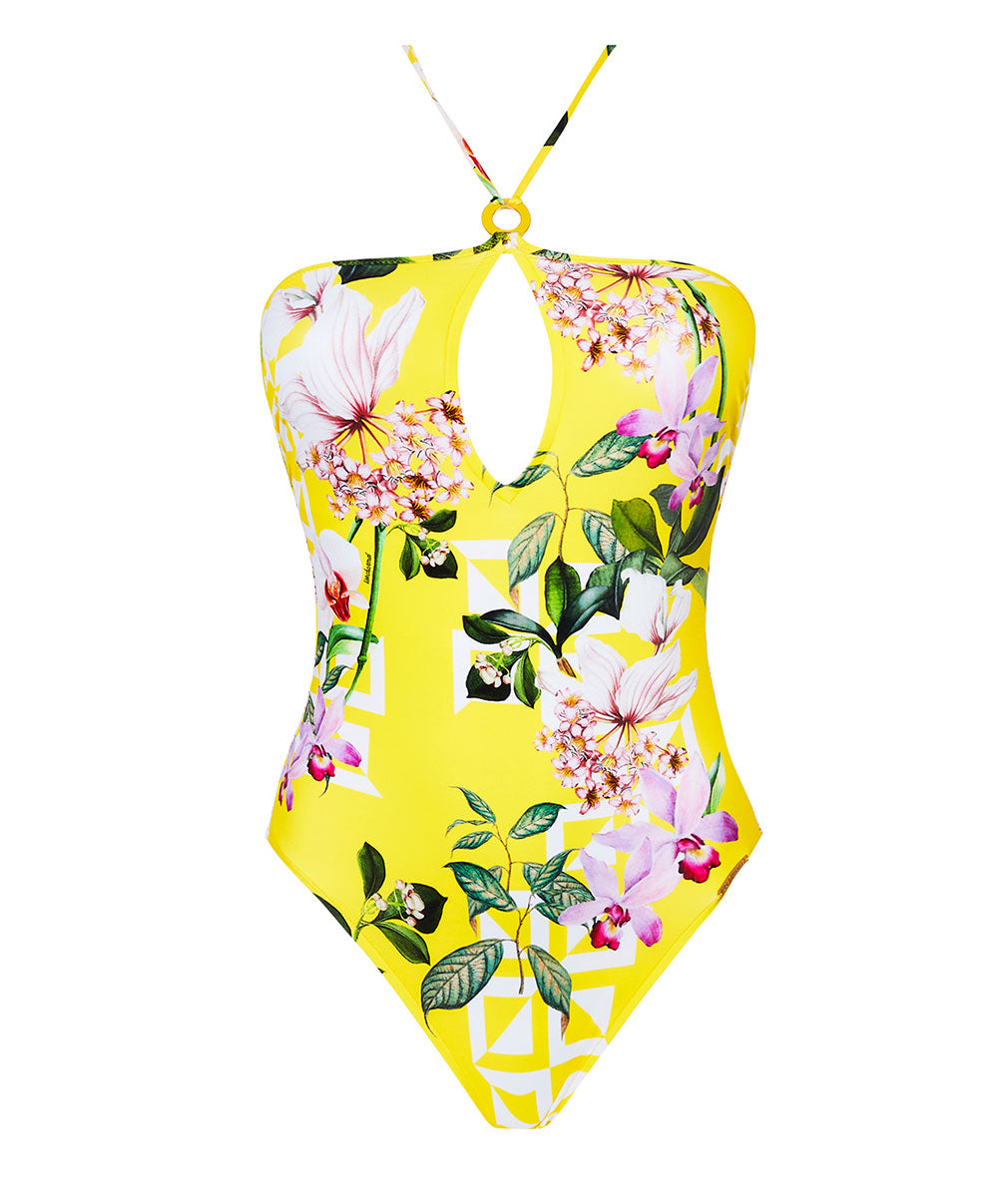 La collection de maillots de bain jaunes Jardin Délice par Lise Charmel : le design exclusif de la ligne met en exergue une brassée de motifs floraux acidulés représentant des fleurs d'oranger des chèvrefeuilles et des orchidées associés à des dessins géométriques blancs qui s'illuminent sur un fond jaune éclatant. Fabriqués dans une matière tonique certifiée Lycra© Beauty les maillots de bain de la collection présentent des coupes épurées un maintien parfait et une silhouette sculptée et offrent des détalis chics tels que le bijou émaillé qui apportent une richesse visuelle supplémentaire. Une gamme beachwear d'essentiels proposent une chemise longue des robes et un paréo qui complèteront à merveille votre tenue de plage.