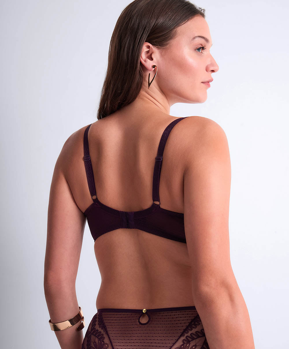 Sa dentelle Leavers, à la fois fine et graphique, se marie à un plumetis aérien pour épouser vos courbes avec sensualité et légèreté. Ce jeu subtil de matière révèle une silhouette tout en douceur, tandis que de précieux détails viennent parfaire chaque pièce : un bijou feuillage au fini martelé, des gouttes dorées et des anneaux délicats, autant de touches raffinées qui illuminent les parures.