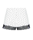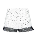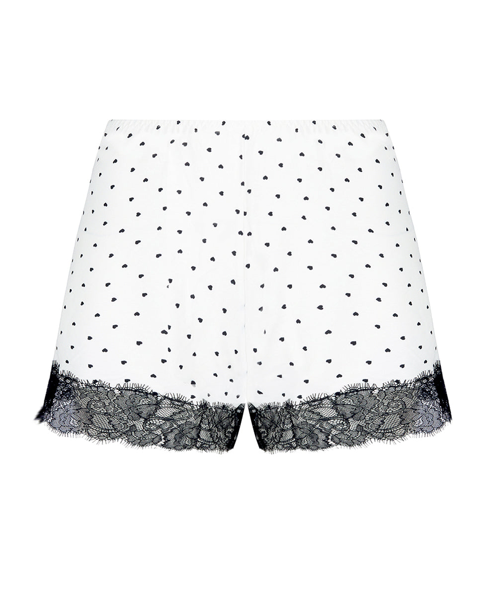Ce short en maille de viscose imprimée offre une sensation de douceur et de légèreté idéale pour le confort au quotidien. Naturellement respirante et fluide, la viscose épouse délicatement la silhouette tout en laissant une grande liberté de mouvement. Son imprimé à pois noirs en forme de cœur, signature de la collection, est sublimé par de délicates finitions en dentelle noire au tour de cuisses, apportant une touche féminine et raffinée. Doté d’une taille élastiquée pour un ajustement confortable, ce short de lingerie léger laisse la jambe joliment découverte et se coordonne parfaitement avec un caraco assorti.