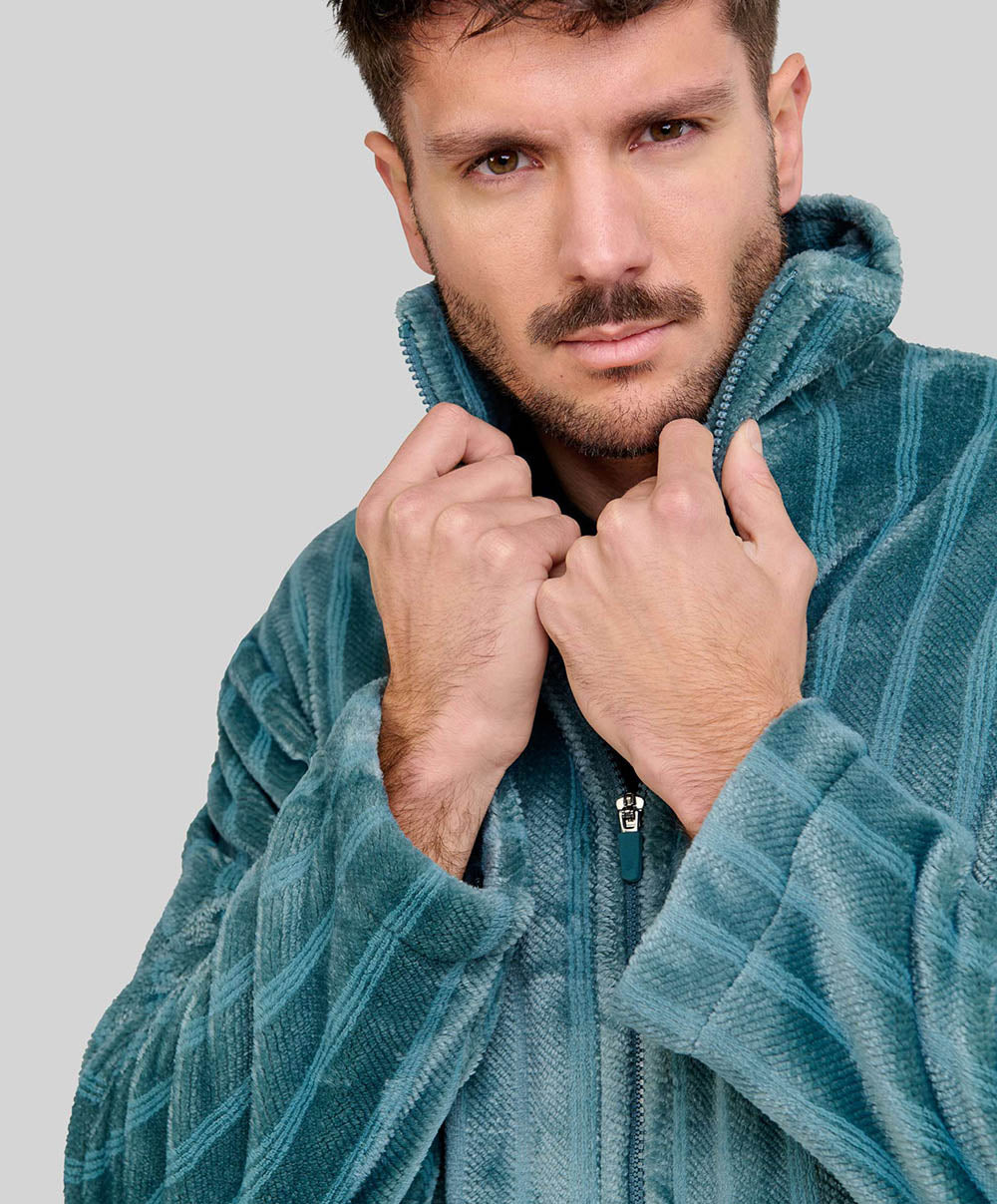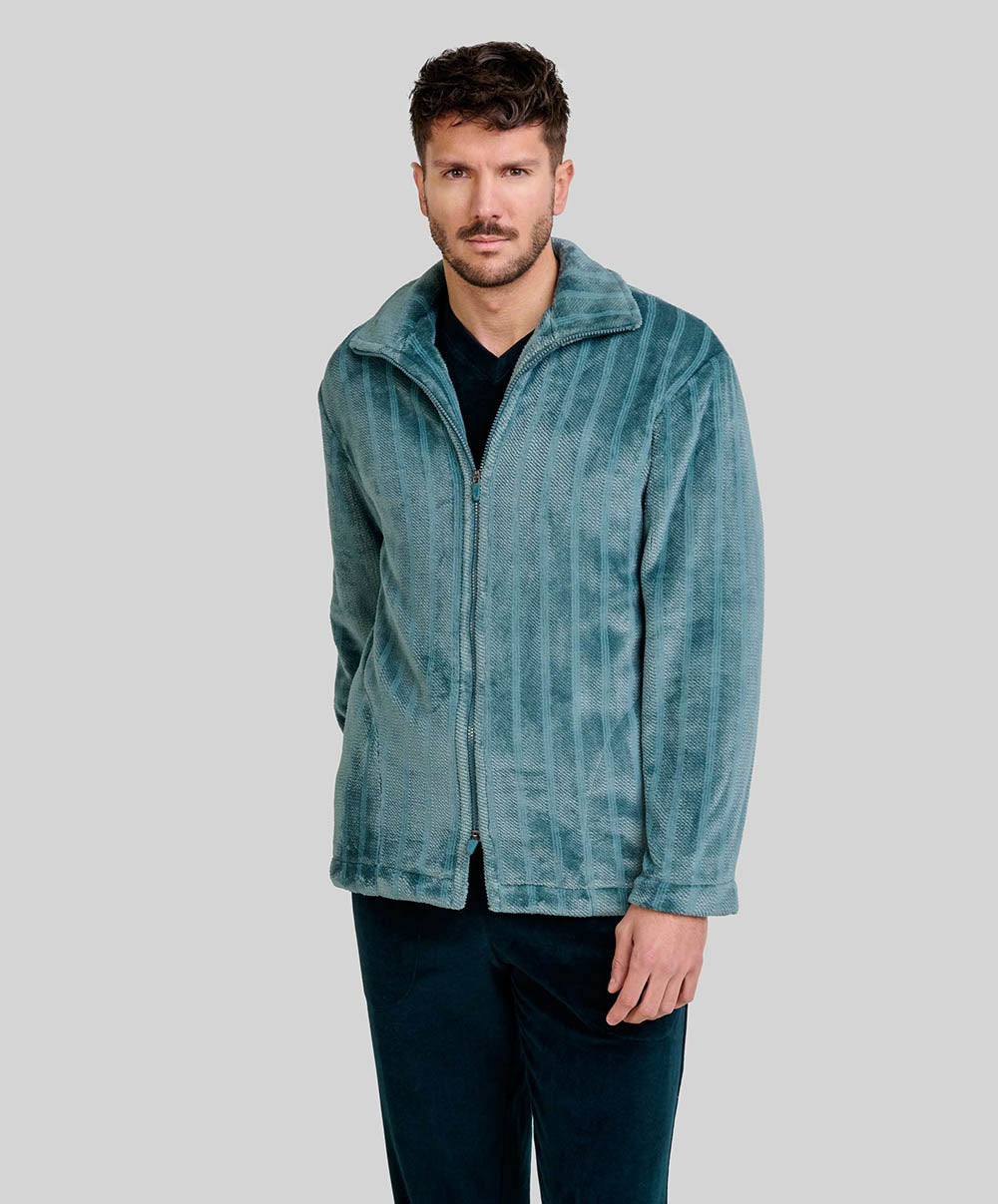 Le tissu jacquard à rayures vertes apporte une touche d’originalité, tout en restant discret et raffiné. Les manches longues protègent efficacement du froid, tandis que les poches latérales pratiques permettent de garder à portée de main clés, mouchoirs ou téléphone. Un indispensable du vestiaire masculin pour les matins frais ou les soirées de détente à la maison.