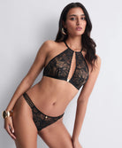 Sexy et raffinée, la brassière After Hours d’Aubade dévoile un décolleté profond, encadré de dentelle florale délicate et mis en valeur par une attache dorée subtile. Sans armatures, elle épouse la poitrine avec confort et légèreté, alliant maintien et sensualité. À l’arrière, le dos se pare d’une guipure ajourée et d’un jeu de liens inspiré du bondage, révélant subtilement la peau et soulignant la silhouette avec sophistication. Une pièce de lingerie française haut de gamme, ornée de bijoux signature, parfaite pour celles qui recherchent une brassière en dentelle sexy, à la fois moderne, élégante et audacieuse.