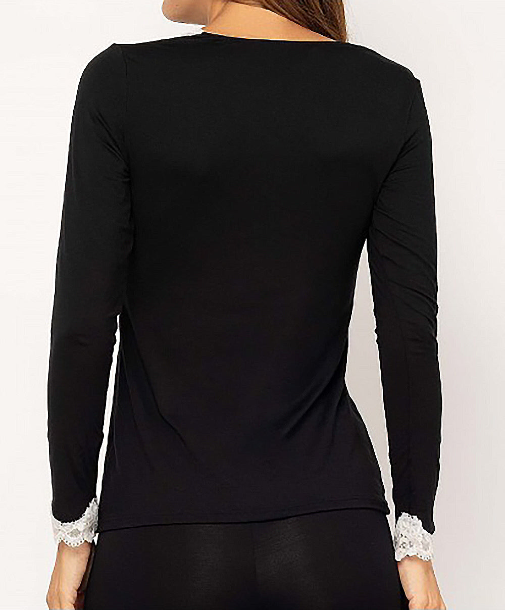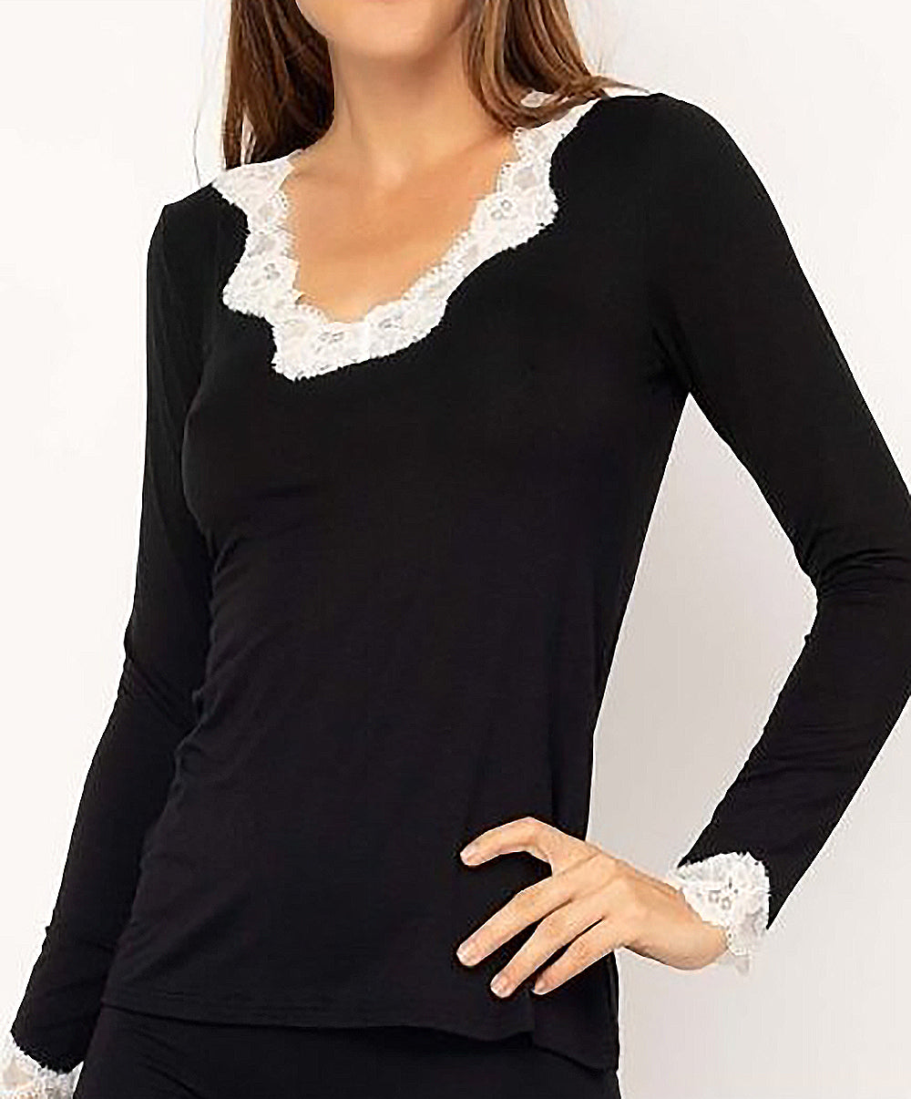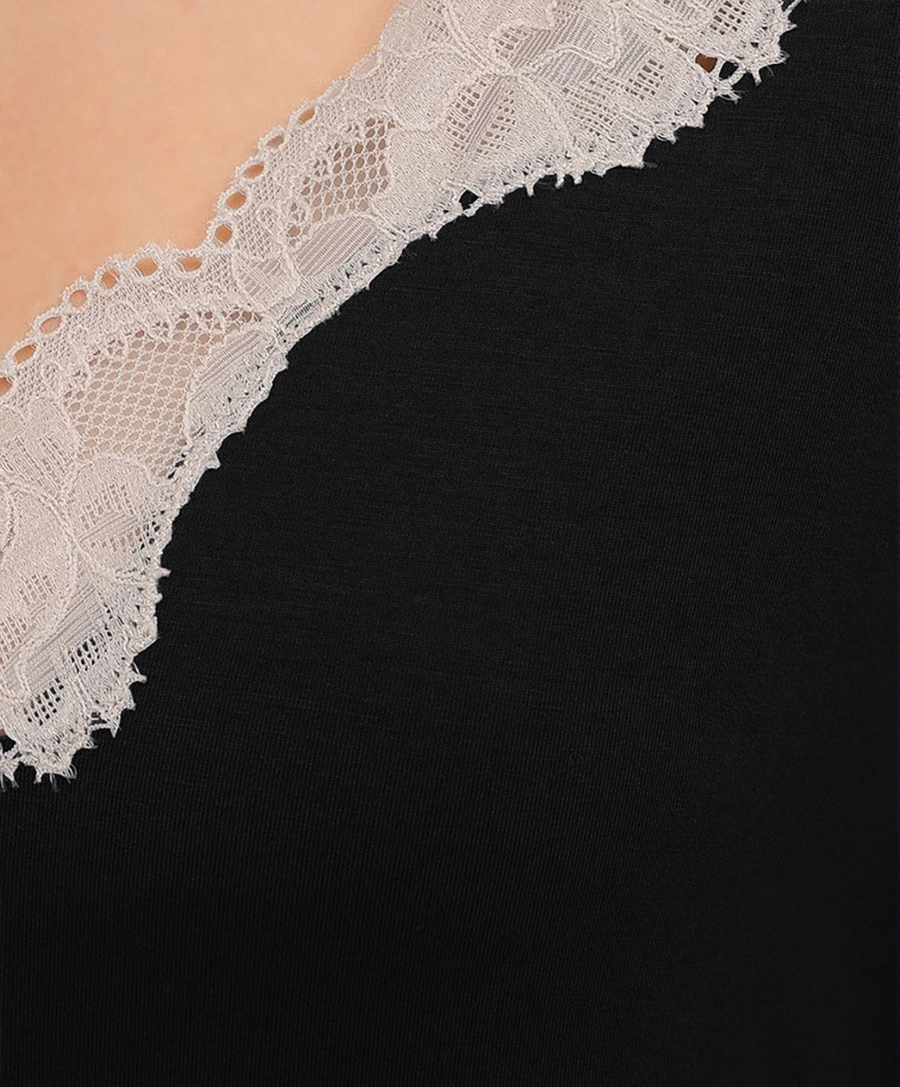 -Vous allez adorer les empiècements de dentelle nacrée pour jouer le total look black au bas de la pièce et au décolleté de ce t-shirt noir qui vous confèreront une élégance toute particulière.