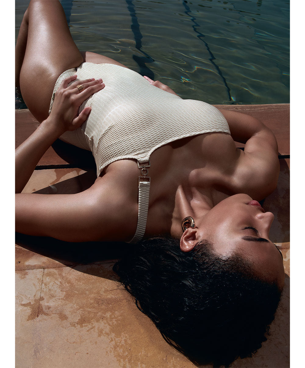 Maille: 77% polyamide, 19% élasthanne, 4% fil métallisé.